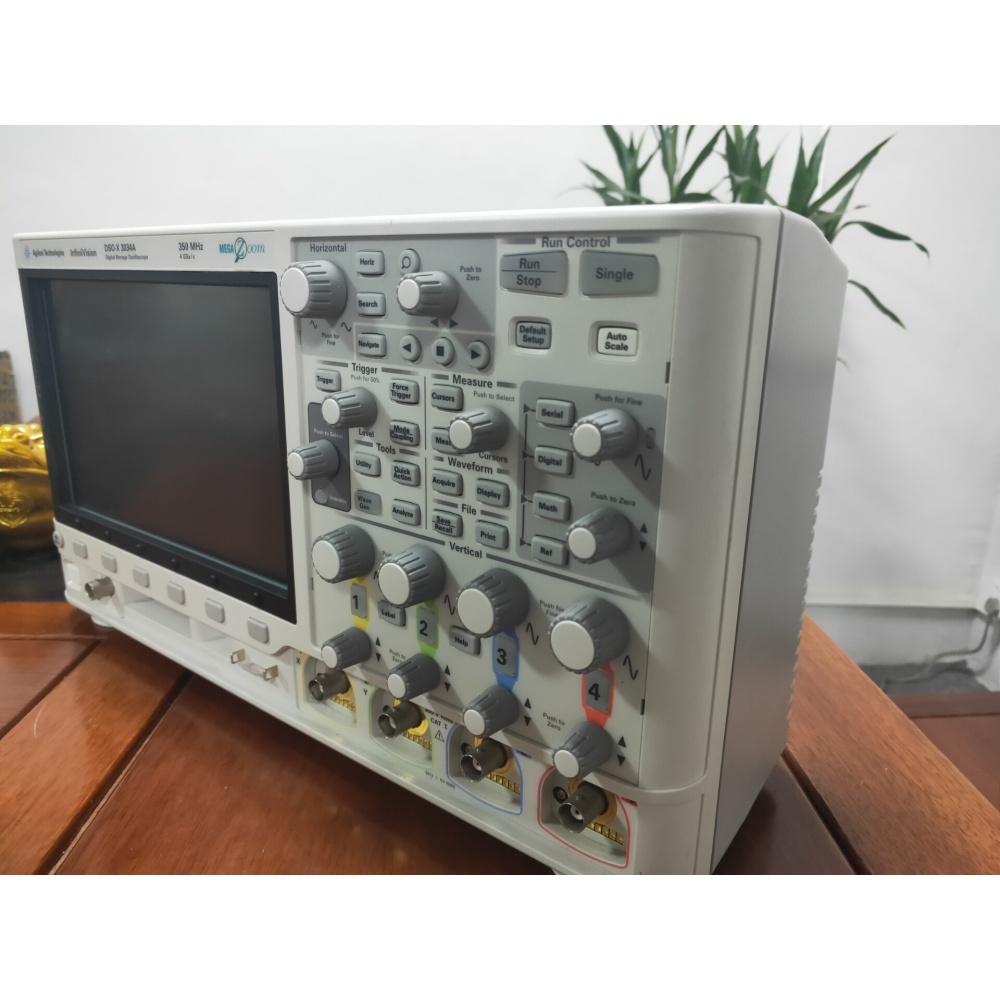DSOX3034A is an InfiniiVision 3000A X-series 350MHz digital signal oscilloscope (DSO) with 4 analogue channels. It sees the most signal detail, does more functions than any other oscilloscope, and gives you maximum investment protection. Industry’s first 6- instruments-in-1 (oscilloscope, digital channels, built-in 20MHz function/ arbitrary waveform generator with modulation, integrated digital voltmeter frequency counter and protocol analyser).